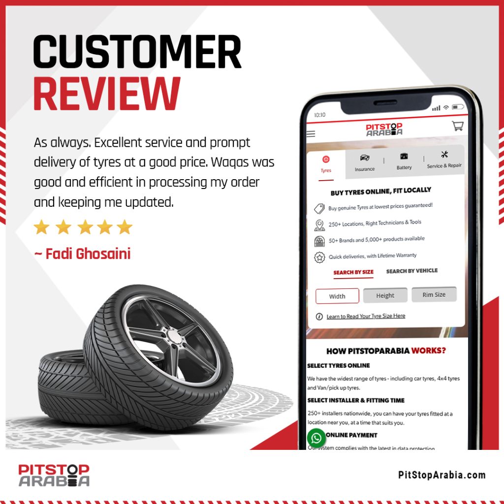 Using PitStop Arabia is simple: you can shop online, compare prices for your tyres, and schedule a fitting at a service center or even have mobile installation at home. Along with tyres, they provide wheel alignment, battery replacement, oil changes, and more.