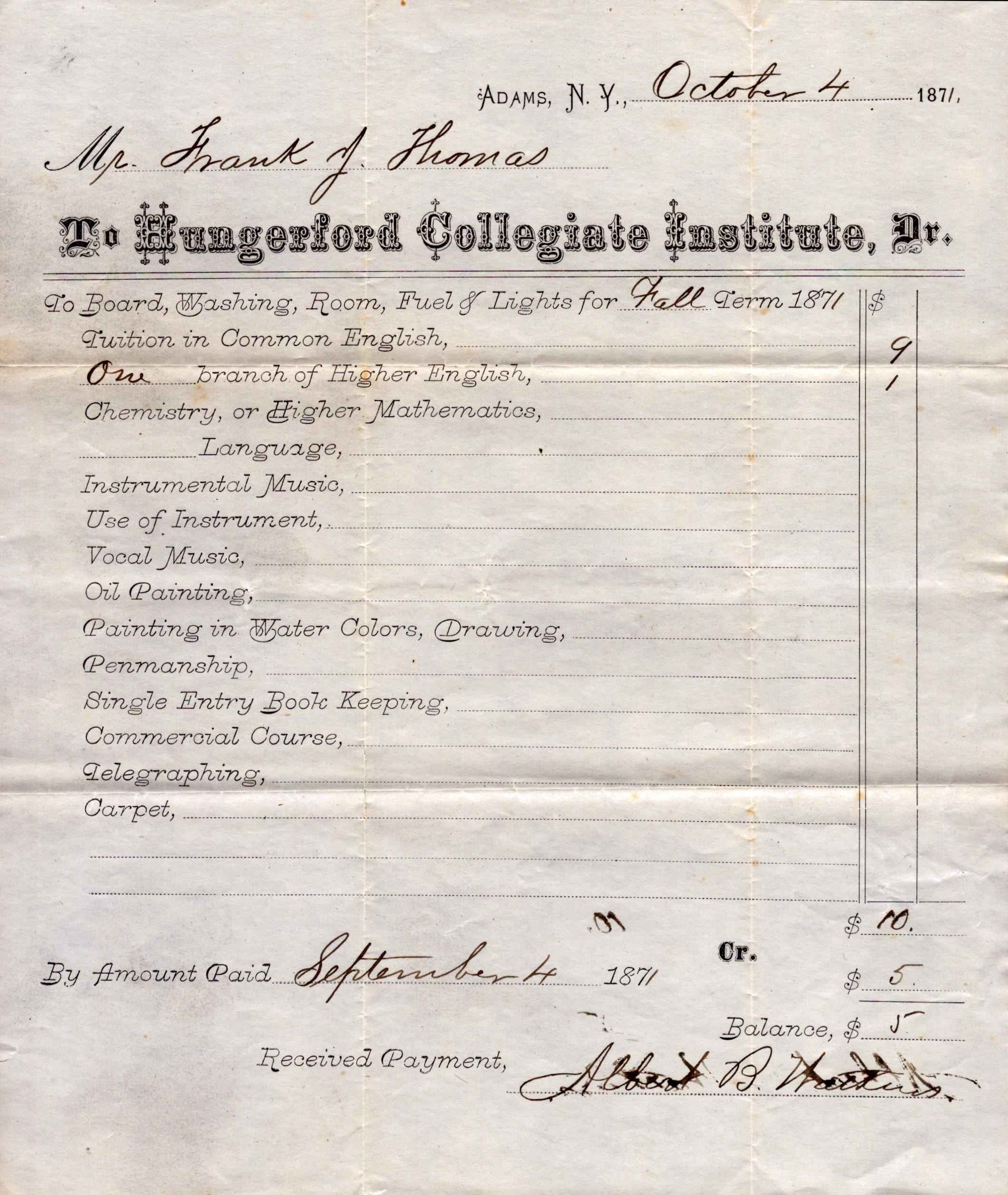 As a private academy, the Hungerford Collegiate Institute faced many of the same financial uncertainties that other private institutions were burdened with in the late nineteenth century. The costs of maintaining the large boarding hall and faculty often exceeded the revenue brought in from tuition, and by 1882, the building was sold for debt attributed to plumbing work, forcing the institution to vacate its modern building for the confines of the Cooper Block in the business center of the village, where its original name, Adams Collegiate Institute, was restored by the Board of Regents on November 16, 1883.